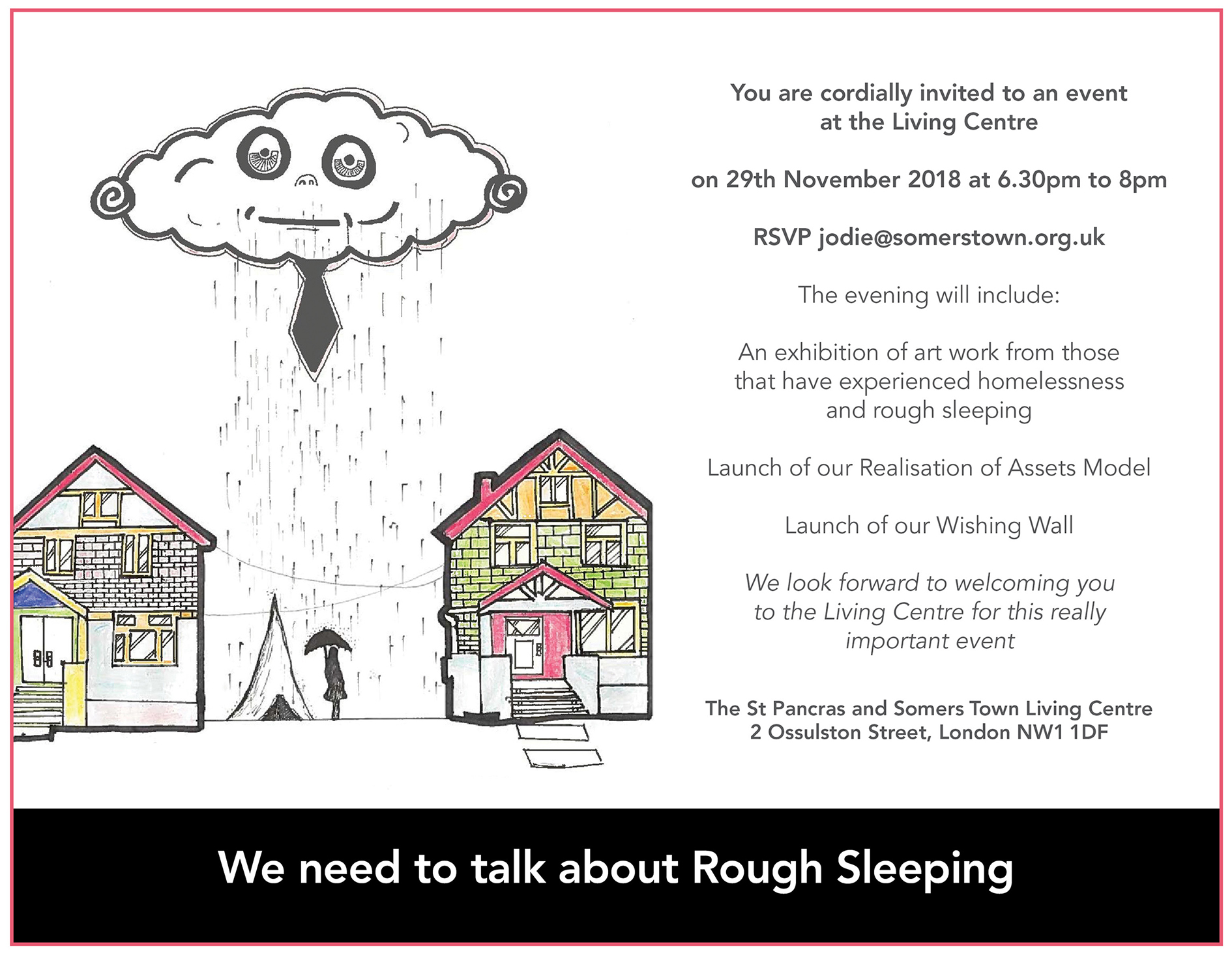 The St Pancras and Somers Town Living Centre cordially invite you an event to tackle rough sleeping in the borough. Taking place at the Somers Town Living Centre the event will feature the launch of a series of initiatives as well as an exhibition of art.